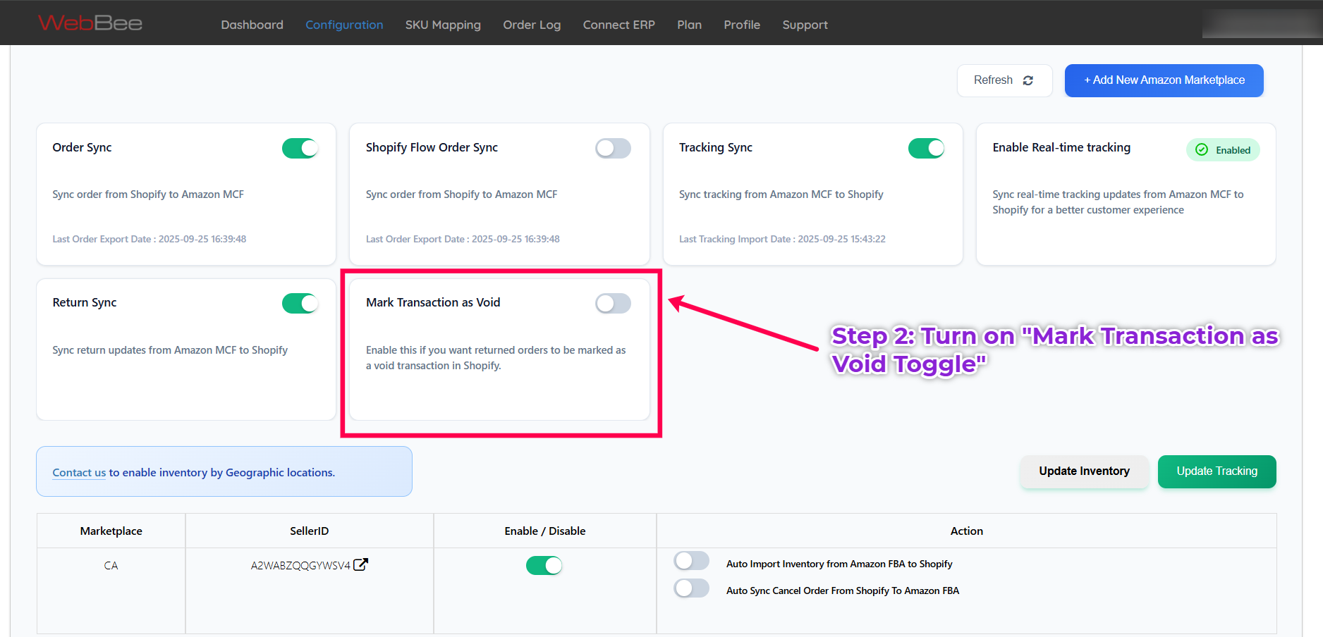 "Mark Transactions as Void" is a toggle that can be found under Marketplace settings in the Amazon MCF by WebBee app. If you enable this toggle, every time an order syncs to Amazon MCF but is unable to be delivered to the customer and is returned to the origin, the order transaction will be marked as void.