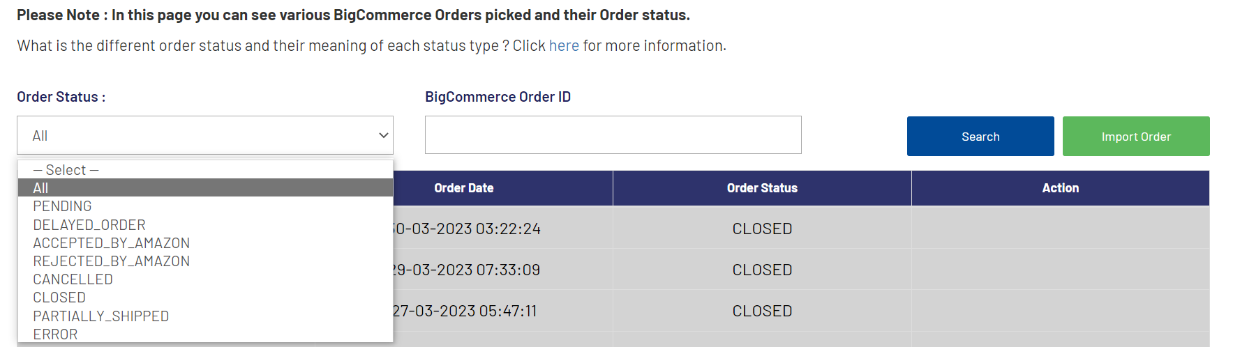 Our order log page contains: One drop-down menu: Order Status. One search field: BigCommerce Order ID. One button: Import Order button. Order Status: From, here you can filter the orders that are either: Pending, Accepted By Amazon, Rejected By ...